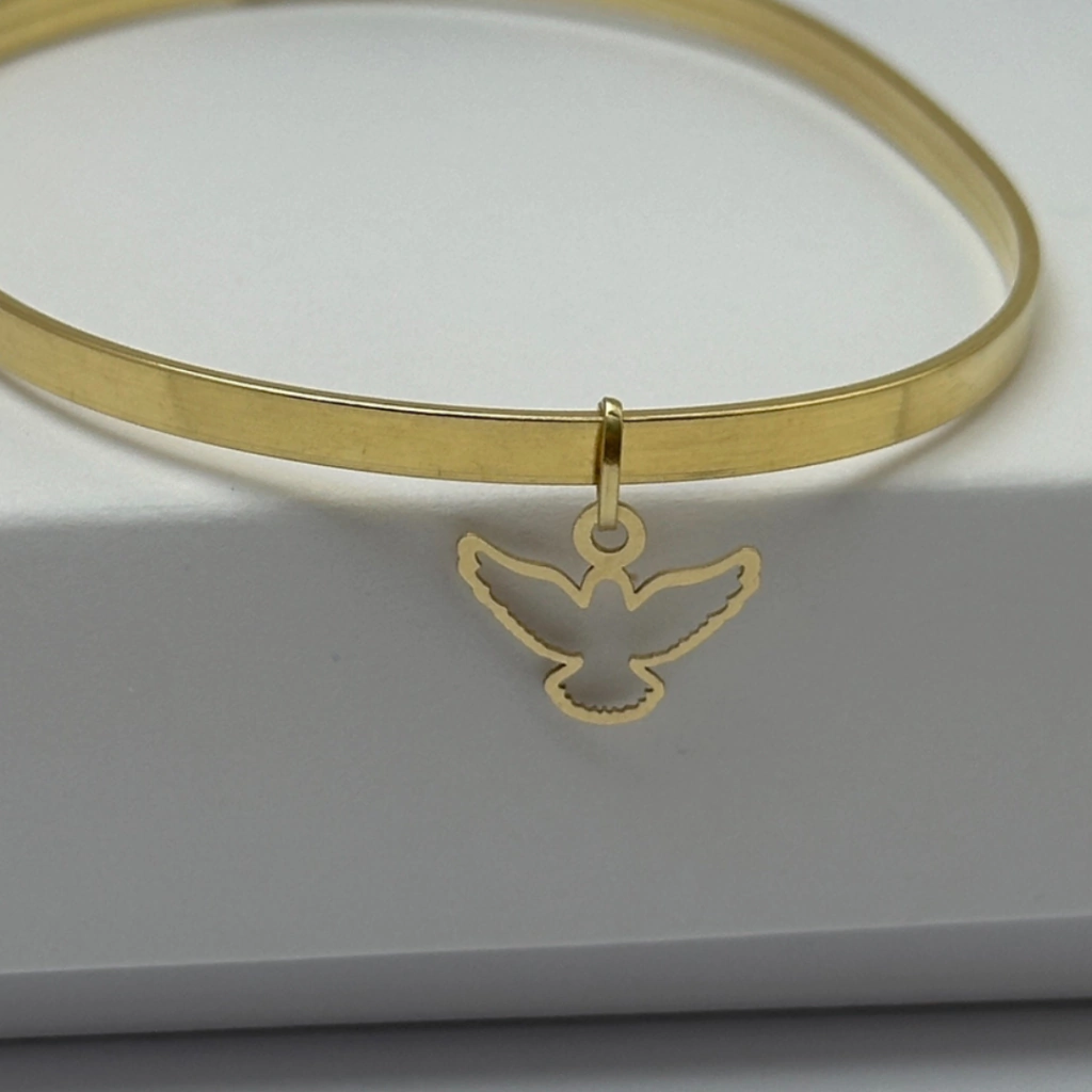 Delicado e cheio de significado, o Pingente Espírito Santo é confeccionado em Ouro 18k, simbolizando fé, proteção e luz. Com 10mm de tamanho e peso aproximado de 0,20g, é uma peça versátil que combina perfeitamente com braceletes, pulseiras e argolas, trazendo um toque especial para qualquer composição.